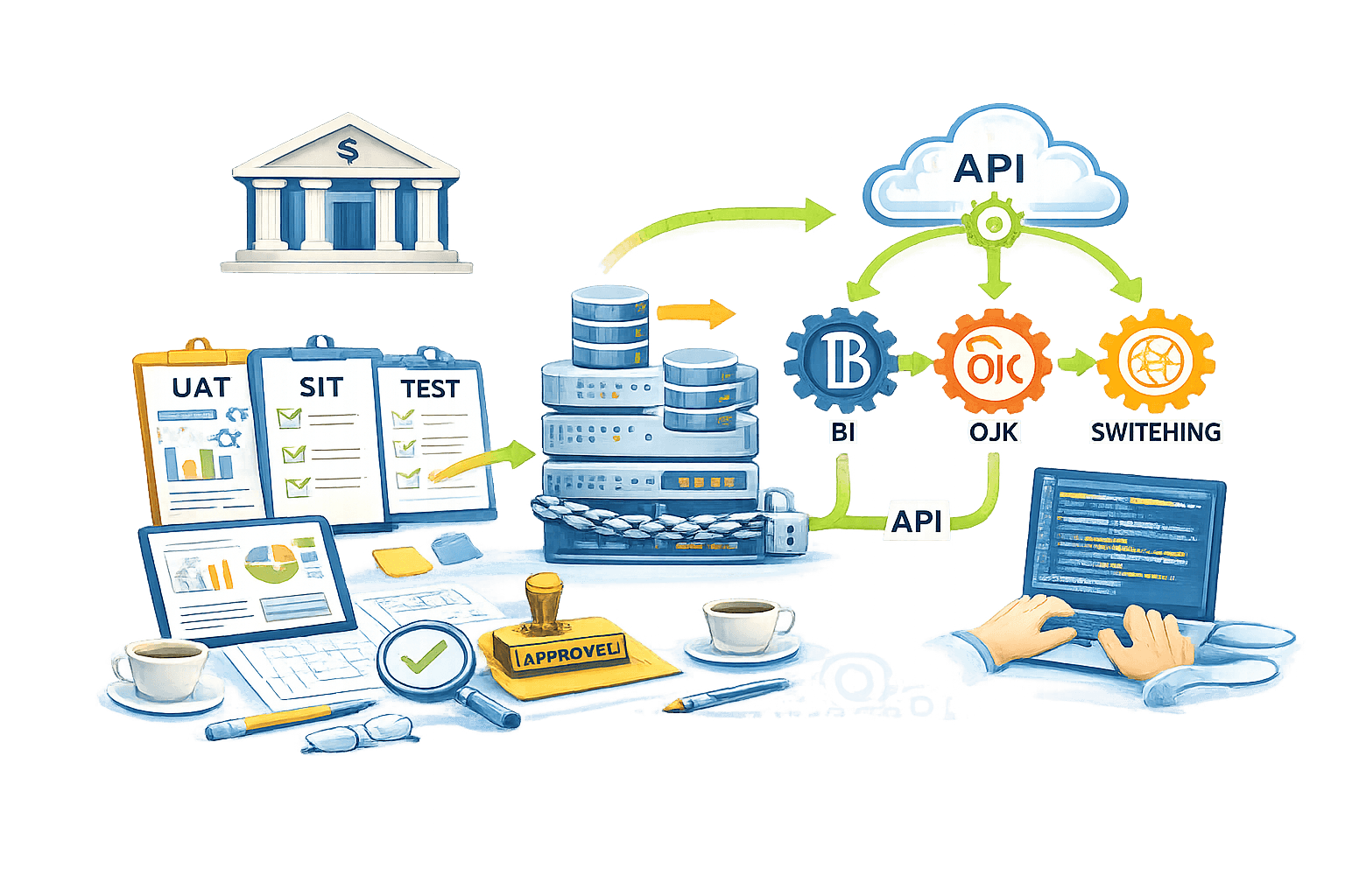 Mulai dari pengujian sistem hingga integrasi API ke core banking dan layanan pihak ketiga (BI, OJK, switching), semuanya kami pastikan berjalan lancar dan aman.