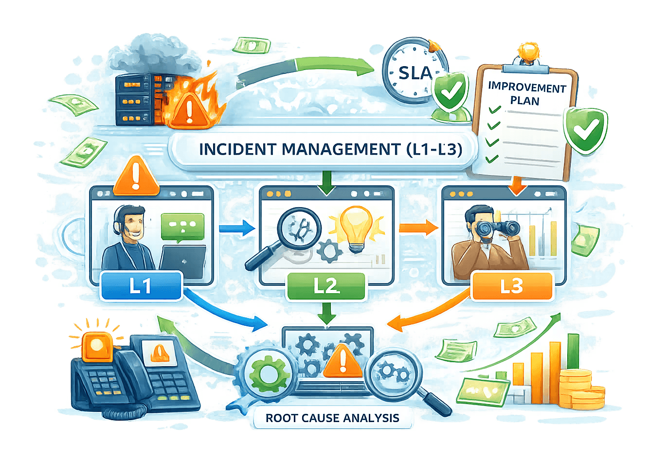 Menangani insiden kritikal sesuai SLA, termasuk root cause analysis dan rekomendasi perbaikan jangka panjang.