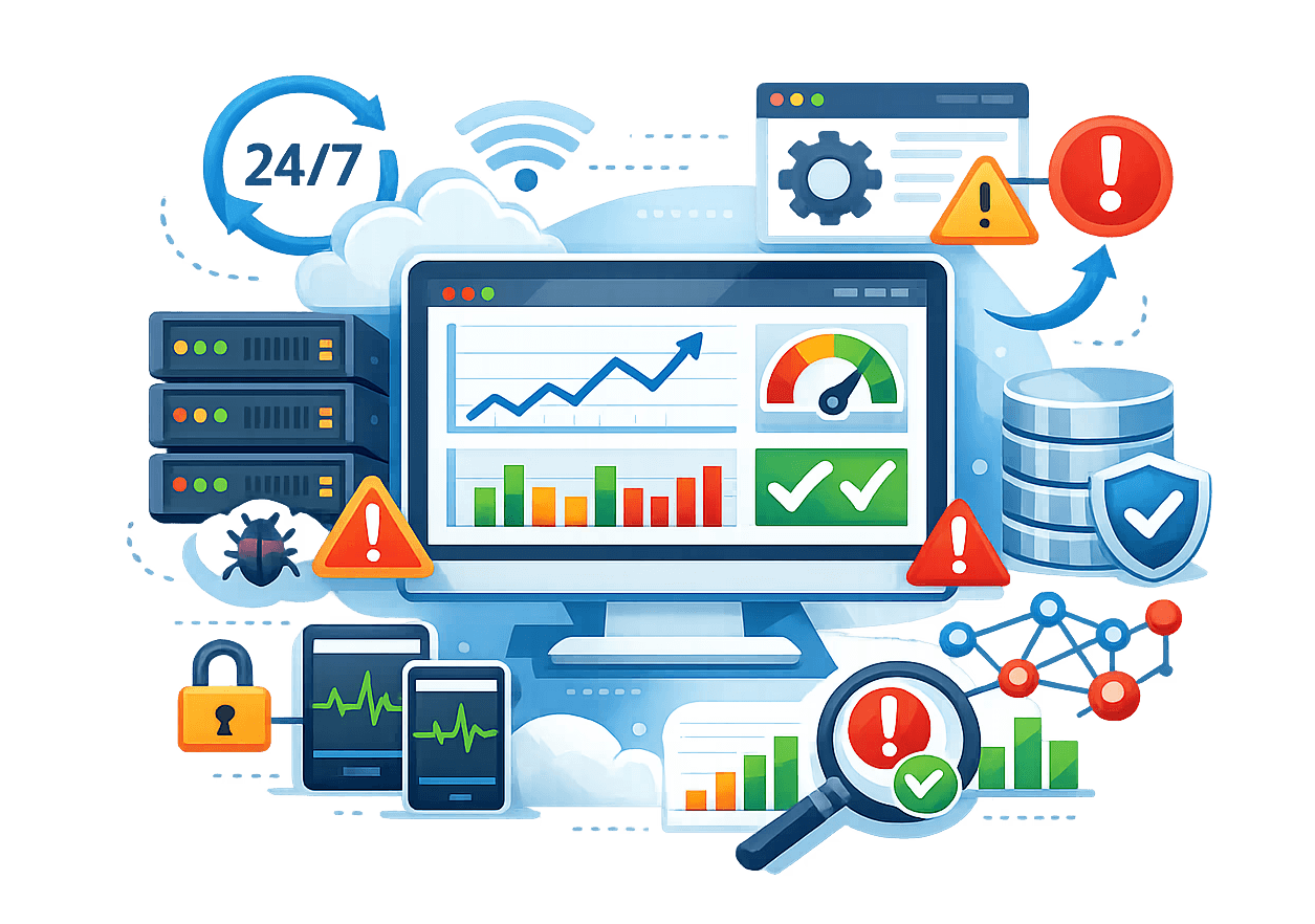 Kami memantau kesehatan server, aplikasi, database, dan jaringan secara real time, untuk mencegah gangguan sebelum terjadi.