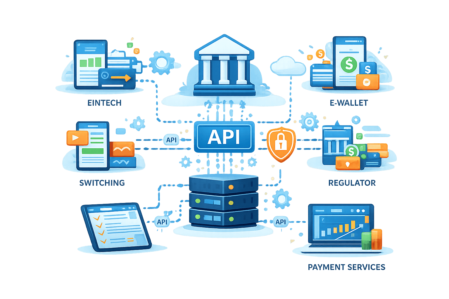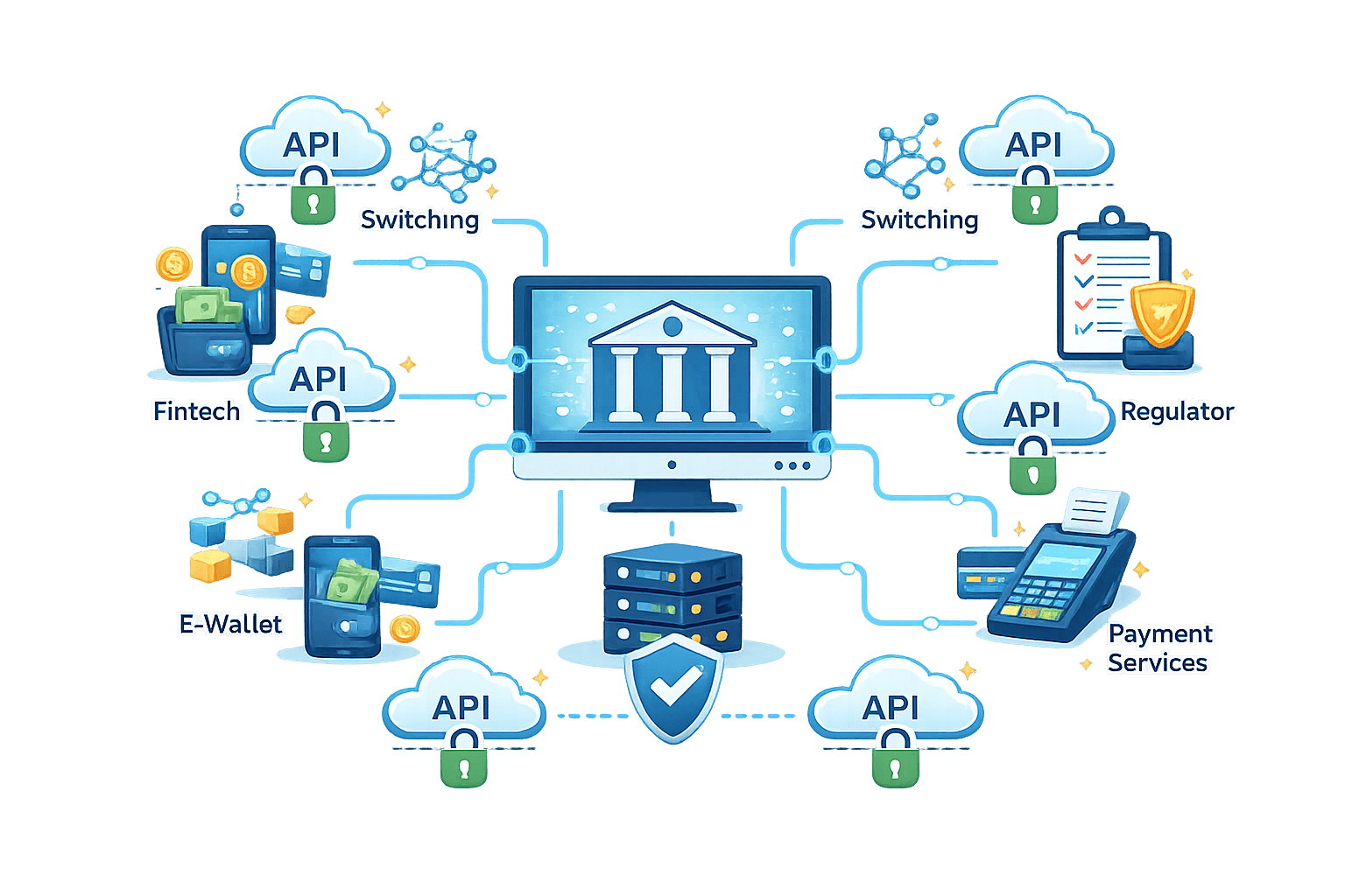 Menghubungkan bank dengan fintech, switching, e-wallet, regulator, dan layanan pembayaran lainnya melalui integrasi API yang aman.