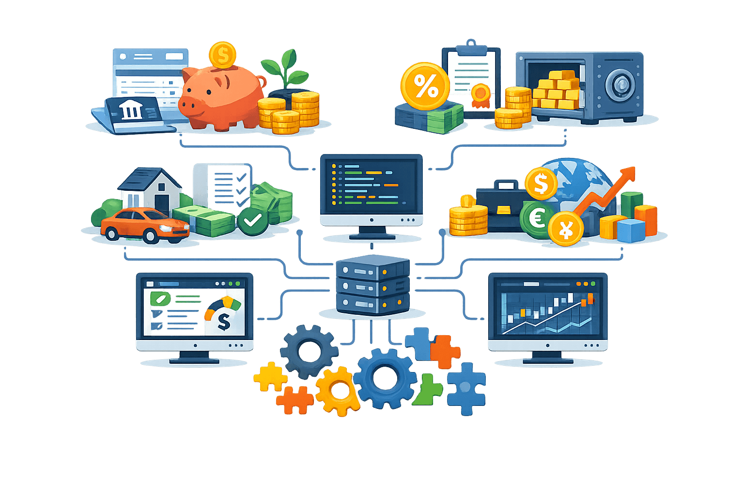Kami mengembangkan modul-modul operasional sesuai proses bank (tabungan, deposito, kredit, treasury, dll.) untuk memenuhi kebutuhan yang tidak tersedia di solusi standar.